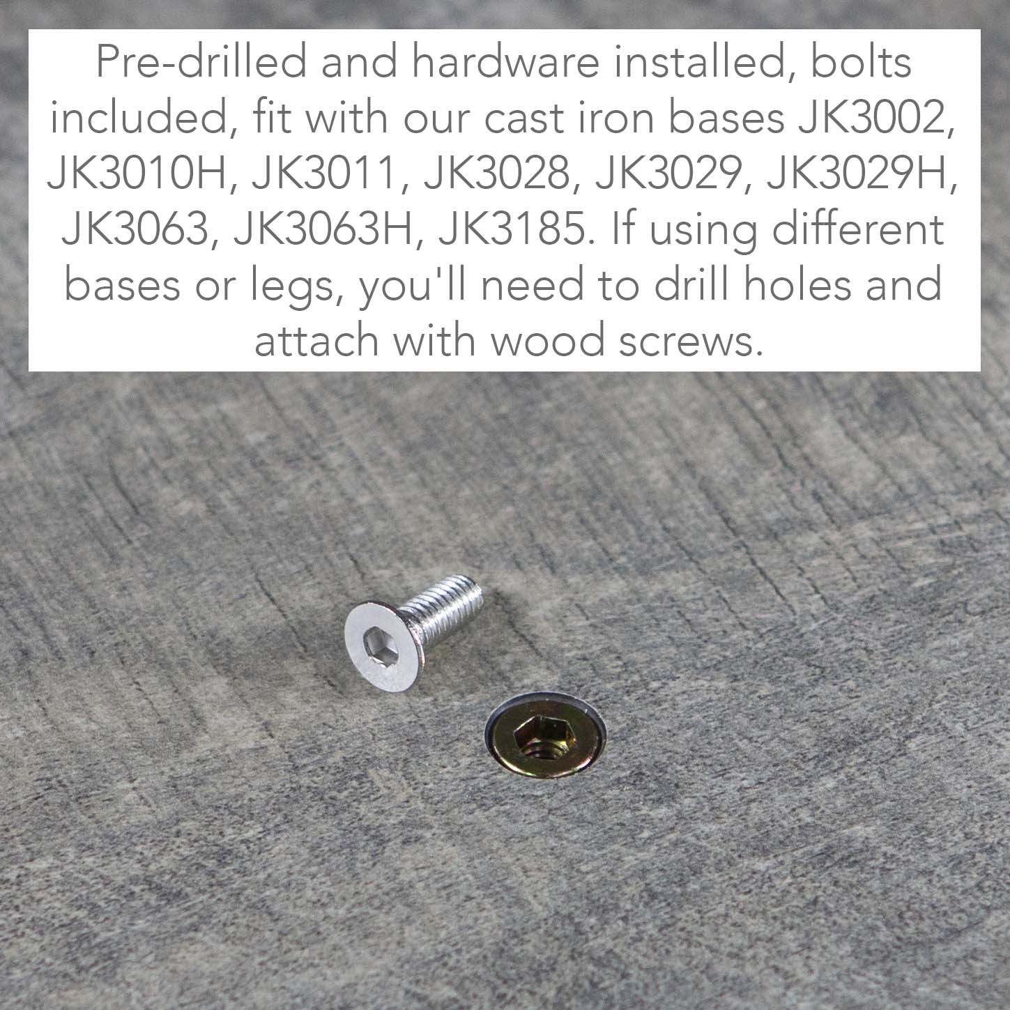 ✅ Pre-drilled and hardware installed, fit with our cast iron bases JK3002, JK3010H, JK3011, JK3028, JK3029, JK3029H, JK3063, JK3063H, JK3185. If using different bases or legs, you'll need to drill holes and attach with wood screws.