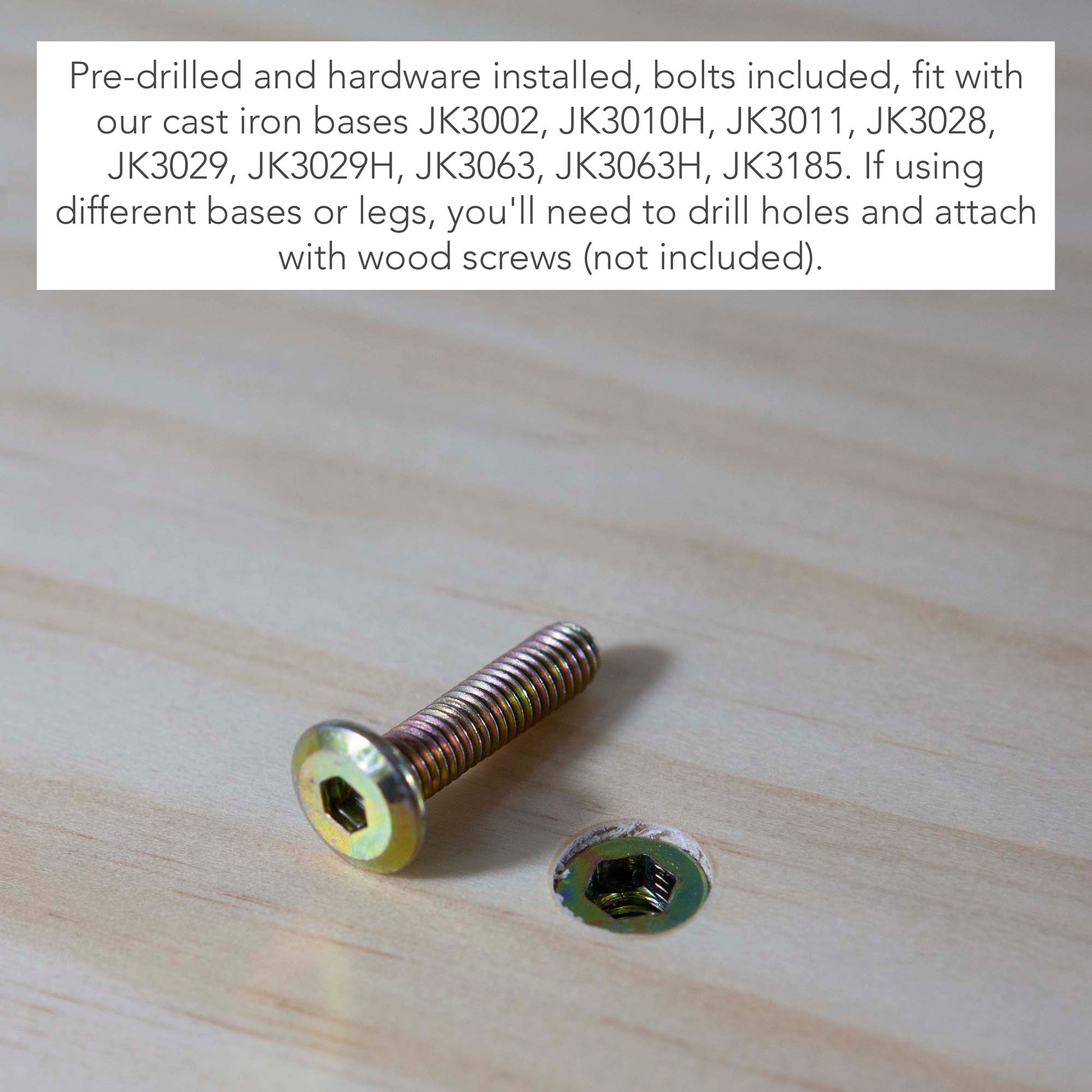 ✅ Pre-drilled and hardware installed, fit with our cast iron bases JK3002, JK3010H, JK3011, JK3028, JK3029, JK3029H, JK3063, JK3063H, JK3185. If using different bases or legs, you'll need to drill holes and attach with wood screws.